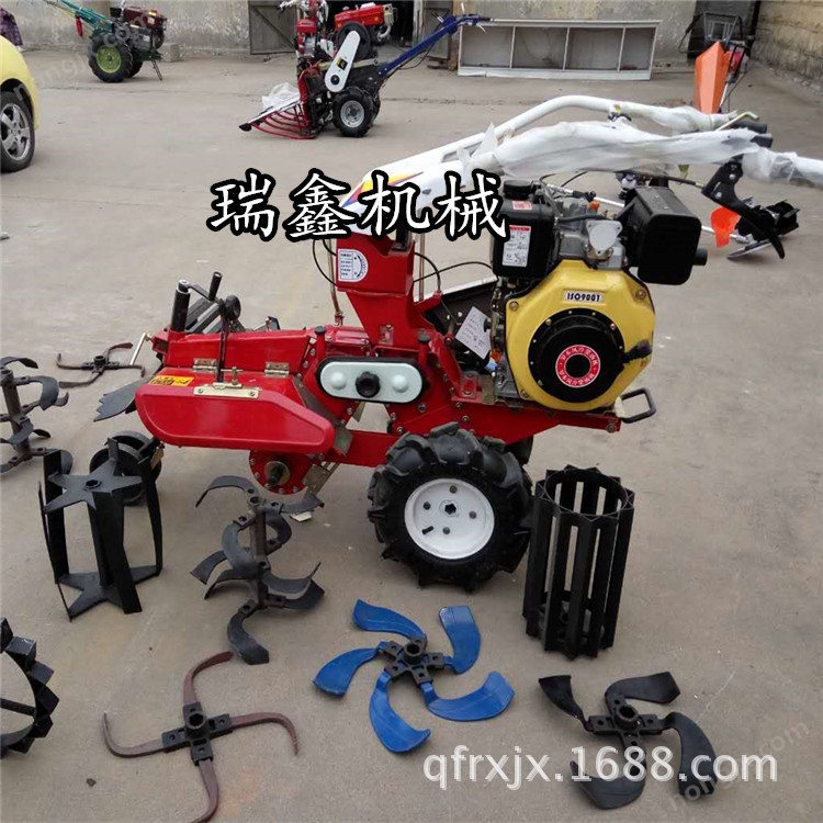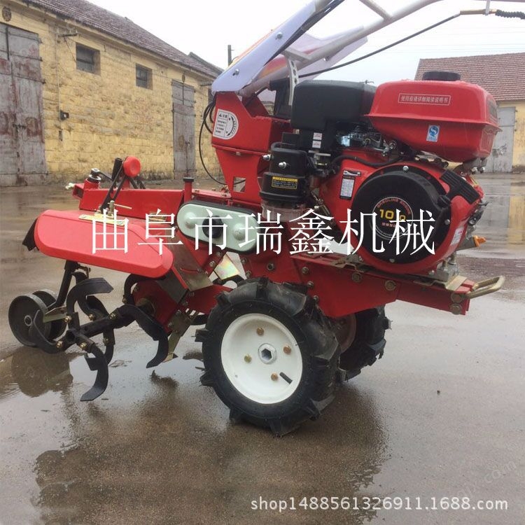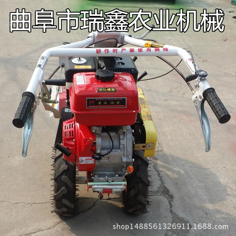 本机器包括机架、可调高低扶手,机架上设有(风冷或水冷)柴油机或汽油机、机架和扶手上设置有变速箱,变速箱的输出轴上设置有能够沿轴移动的驱动轮或链轨.传动方式主要有:全齿轮传动、皮带传动、链条传动三种传动方式.该机具有重量轻,油耗低、相对功率大,结构紧凑、机动性强、操纵轻便灵活的特点。可爬坡、越埂、阶梯性强。广泛适用于平原、山区、丘陵的旱地、水田、果园、菜地、烟地的深旋耕、浅旋耕、犁耕。配上相应机具可进行旱地旋耕、水田旋耕、抽水、开沟、喷淋、喷药除草碎土等作业,还可牵引拖车进行短途运输,是大中型农机无法媲美的多功能田园管理机,工作稳定可靠、使用寿命长、维修方便等特点。是进入农民家庭理想的田园管理机。